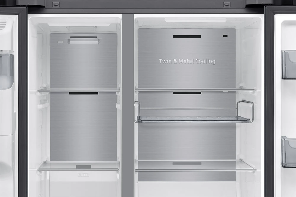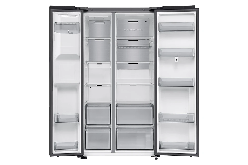 Americká chladnička • energetická třída E • kapacita 614 l (389 / 220) • Twin Cooling • Metal Cooling • 21,5" FamilyHub displej • automatické otevírání dveří • chytrá konverze • Wi-Fi • AI funkce • dispenzor vody a ledu • připojení na vodu • hlučnost 34 dBA • spotřeba 352 kWh • vnitřní kamera • možnost hlasového ovládání přes Bixby (pouze anglicky) • 13 kg/24h mrazící kapacita • funkce No frost • funkce rychlého chlazení a mrazení • 178 cm výška • barva: černá