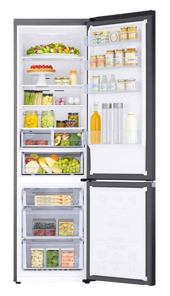 Kombinovaná lednice s mrazákem dole • en. třída B • objem 387 l (chladnička 273 l; mrazák 114 l) • 10letá záruka na kompresor • True No Frost • SpaceMax • chlazení Twin Cooling • Cool Select+ • rychlé funkce Power Cool a Power Freeze • unikátní zásuvky Optimal Fresh+ a Humidity Fresh • zadní design Clean Back • zapuštěné dveře • LED osvětlení • klimatická třída: SN, N, ST, T • hlučnost: 35 dB • rozměry: 203 × 59,5 × 65,8 cm (v × š × h) • barva: černý nerez