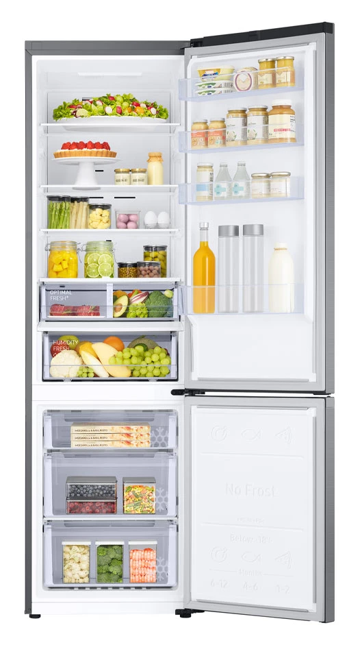 Kombinovaná lednice s mrazákem dole • en. třída B • objem 387 l (chladnička 273 l; mrazák 114 l) • 20letá záruka na kompresor • True No Frost • SpaceMax • chlazení Twin Cooling • Cool Select+ • rychlé funkce Power Cool a Power Freeze • unikátní zásuvky Optimal Fresh+ a Humidity Fresh • zadní design Clean Back • zapuštěné dveře • LED osvětlení • klimatická třída: SN, N, ST, T • hlučnost: 35 dB • rozměry: 203 × 59,5 × 65,8 cm (v × š × h) • barva: nerez