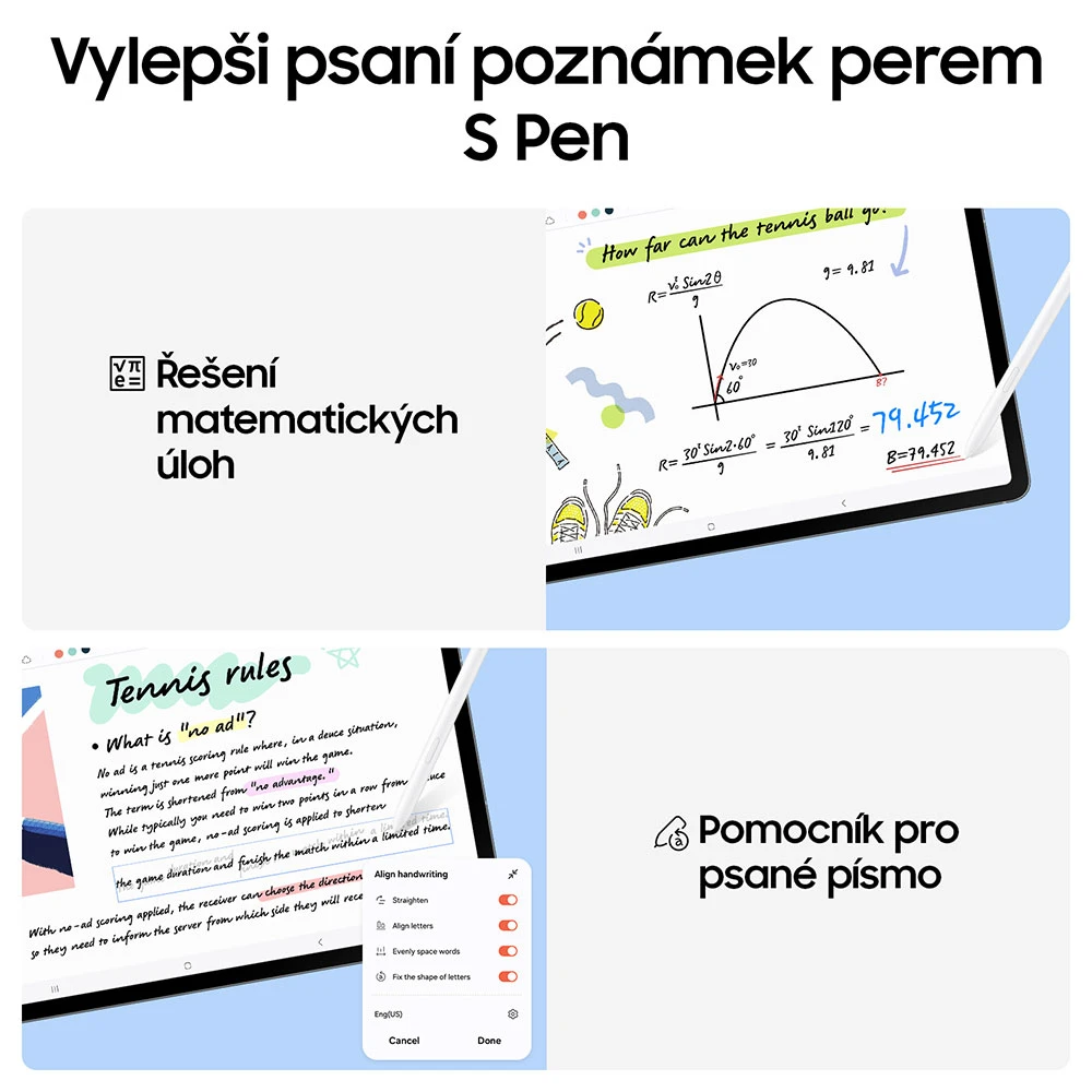 Celokovový tablet s 13,1" LCD displejem o rozlišení 2 880 × 1 800 px (90Hz, 800 nitů, DCI-P3) • 8jádrový procesor Exynos 1580 • 8GB RAM • 128GB uložiště (microSD až 2 TB) • zadní 13MPx fotoaparát • přední 12MPx fotoaparát • dotykové pero S Pen • stereo reproduktory • čtečka otisků prstů • Wi-Fi 6 • Bluetooth 5.3 • GPS • Glonass • Galileo • Beidou • USB-C • 10 090mAh baterie s 45W rychlonabíjením • Android 15, OneUI 7.1 • Samsung DeX • IP68 • barva: šedá
