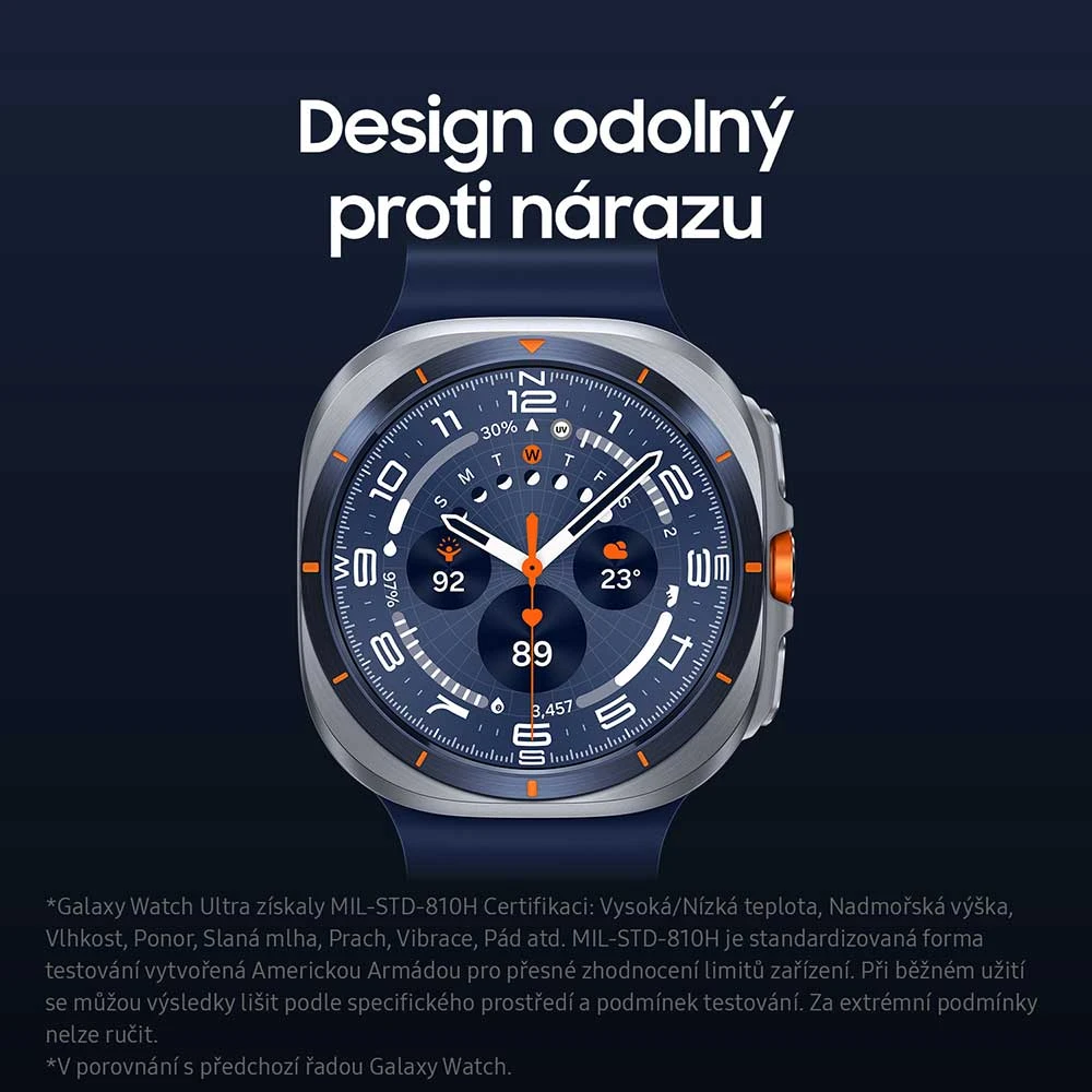 S úchvatnými Galaxy Watch Ultra (2025) můžeš klidně vyrazit do nepohody. Největší model Watch je z velké části vyrobený z titanu a nadchne výjimečnou odolností, kterou stvrzují stupně ochrany MIL-STD-810H, IP68 a také 10 ATM. S hodinkami se klidně na chvíli vydej až do stometrové hloubky, ale poradí si také s teplotami −20 až 55 °C, takže pokud neholduješ vodě, mohou tě doprovázet na velehoru nebo třeba do pouště. Dobrodruhy a cestovatele potěší také dvojité GPS, sportovci ocení možnost přepínat sporty Akčním tlačítkem (režim Multisport). Unikátní výbavu modelu Ultra představuje také hlasitá, 86dB bezpečnostní siréna, pomocí které můžete v případě nouze přivolat pomoc.