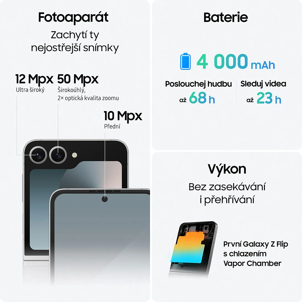 Mobilní telefon s ohebným 6,7" FHD+ Dynamic AMOLED 2X displejem (2 640 × 1 080 px, 1-120 Hz) • vnější 3,4" Super AMOLED obrazovka (748 × 720 px,) • Snapdragon 8 Gen 3 • 12GB RAM • 256GB ROM • zadní fotoaparáty – 50MPx (f/1,8) + 12MPx (f/2,2) • OIS • přední 10MPx fotoaparát (f/2,2) • stereo reproduktory • Dolby Atmos • boční čtečka otisků • 5G • Wi-Fi 6E • Bluetooth 5.3 • NFC • GPS • USB-C • 4 000mAh baterie s rychlým i bezdrátovým nabíjením • Android 14 • IPX8 • barva: šedá