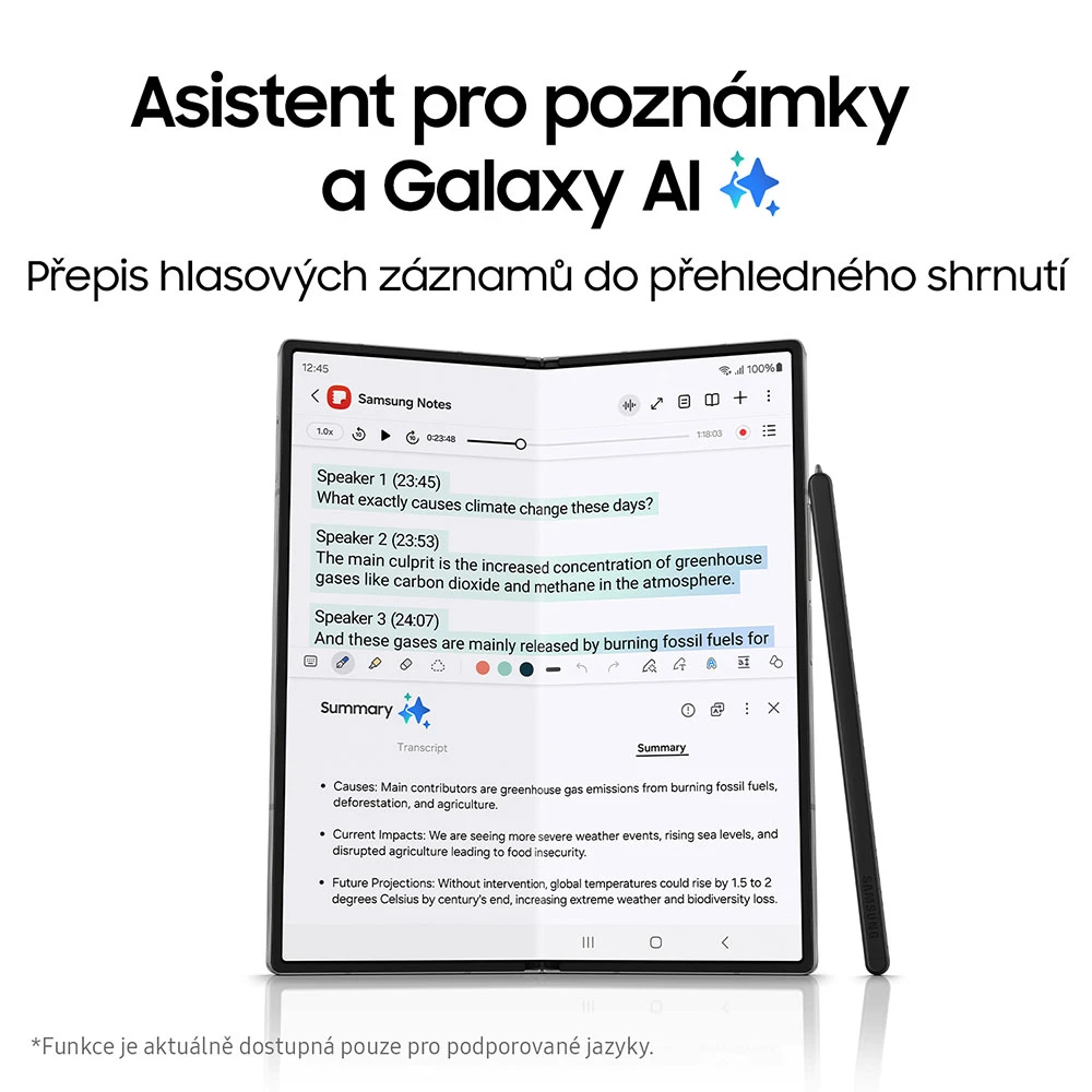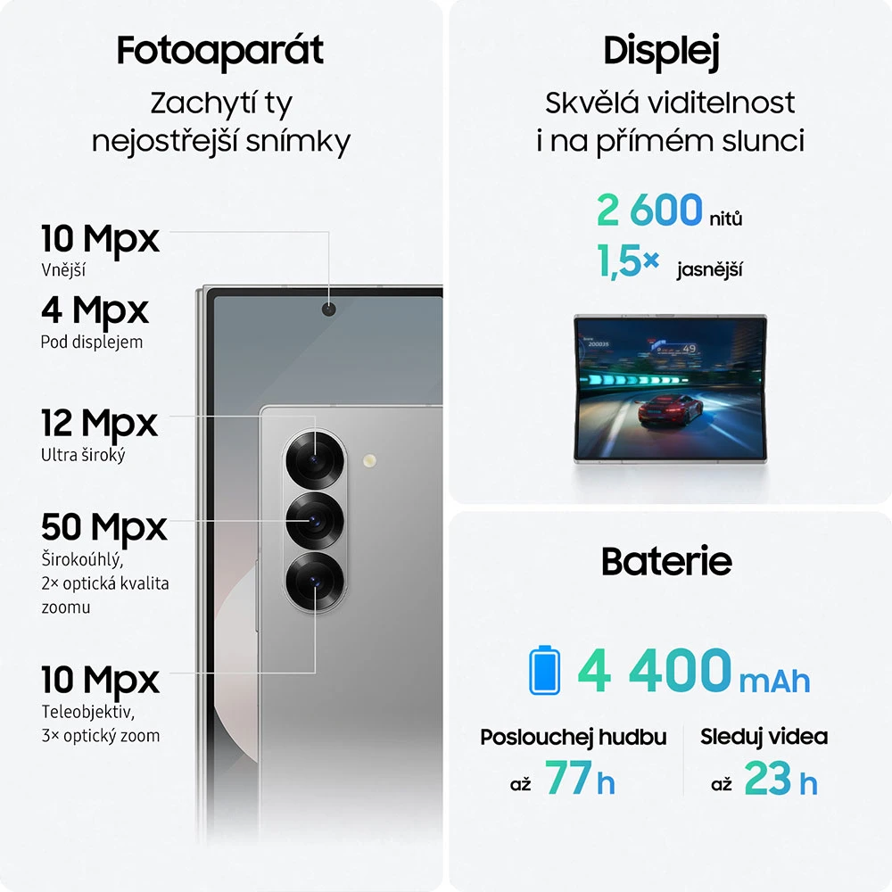 Smartphone s ohebným 7,6" Quad HD+ Dynamic AMOLED 2X displejem (2160×1856 px,1-120 Hz) • vnější 6,3" AMOLED displej (2376×968 px,1-120 Hz) • Snapdragon 8 Gen 3 • 12GB RAM • 512GB ROM • zadní foto. 50 MPx (f/1,8) + 12MPx (f/2,2) + 10MPx (f/2,4) • OIS • přední foto. 4MPx (f/1,8) + 10MPx (f/2,2) • stereo repro. • Dolby Atmos • boční čt. otisků •podp. S Pen • Wi-Fi • 5G • Bluetooth 5.3 • NFC • UWB • USB-C • Samsung DeX • 4400mAh bat. s rychlým i bezdrát. nab. • Android 14 • IP48 • barva: modrá