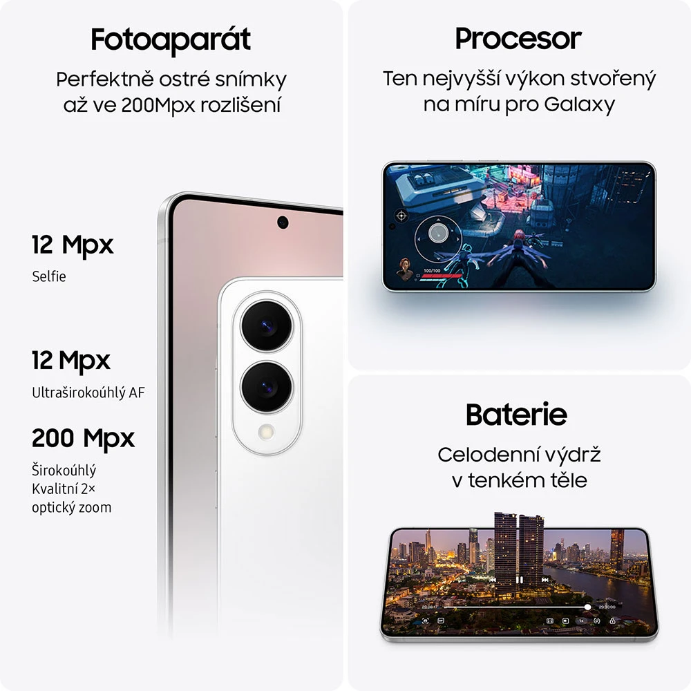 Použití AI funkcí v průběhu roku 2025 je bezplatné. Po uplynutí tohoto období může být vyžadováno předplatné. Data, dostupnost a podporované funkce se mohou v závislosti na jednotlivých aplikacích nebo zemích lišit. * Použití některých funkcí Samsung AI může vyžadovat přihlášení do účtu Samsung Account. *Společnost Samsung neposkytuje žádné přísliby, ujištění ani záruky týkající se přesnosti, úplnosti nebo spolehlivosti výstupu poskytovaného funkcemi AI. * Dostupnost funkcí Galaxy AI se může lišit v závislosti na jednotlivých zemích/regionech/verzích operačního systému/rozhraní One UI/modelů zařízení a telefonních operátorů/distributorů. * Základní funkce Galaxy AI poskytované společností Samsung jsou bezplatné. Budoucí verze mohou obsahovat vylepšené funkce nebo nové služby, které budou nabízeny za poplatek. Na funkce AI poskytované třetími stranami se mohou vztahovat odlišné podmínky. Základní funkce Galaxy AI jsou služby uvedené v části „Pokročilá inteligence“ aktuálních podmínek používání služeb společnosti Samsung. Podrobnosti naleznete Zde