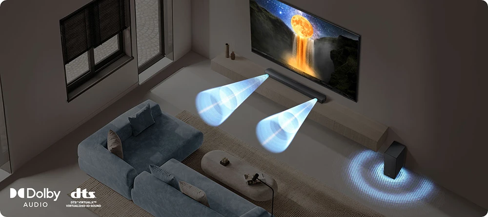 Soundbar s 3.1kanálovým audiem • vestavěný středový reproduktor • funkce Q-Symphony • autentický 3D zvuk • podpora formátů Dolby Audio a DTS Virtual:X • prostorové 3D audio • funkce adaptivního zvuku • režim zesílení hlasu • herní režim • noční režim • port HDMI ARC • Bluetooth