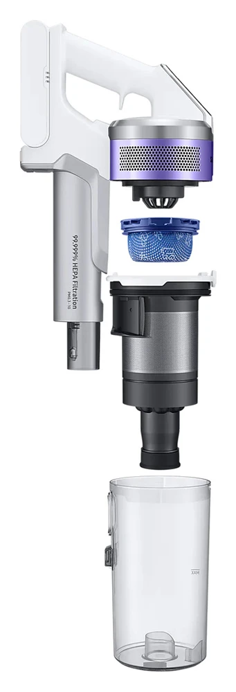 Akumulátorový tyčový vysavač • systém Jet Cyclone • 99,999% separace nečistot a alergenů • digitální invertorový motor • 5vrstvá filtrace • kartáč Soft Action Brush • vysoký sací výkon až 150 W • 3 rychlosti • 0,8l zásobník na nečistoty • systém snadného čištění • Li-Ion baterie s až 40min výdrží • kompaktní rozměry a odlehčený design (tělo vysavače váží jen 1,48 kg) • možnost stolního i nástěnného nabíjení • LED displej • nástavce: kombinovaný; prodlužovací štěrbinová hubice • barva: fialová