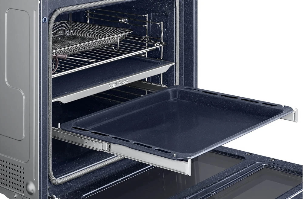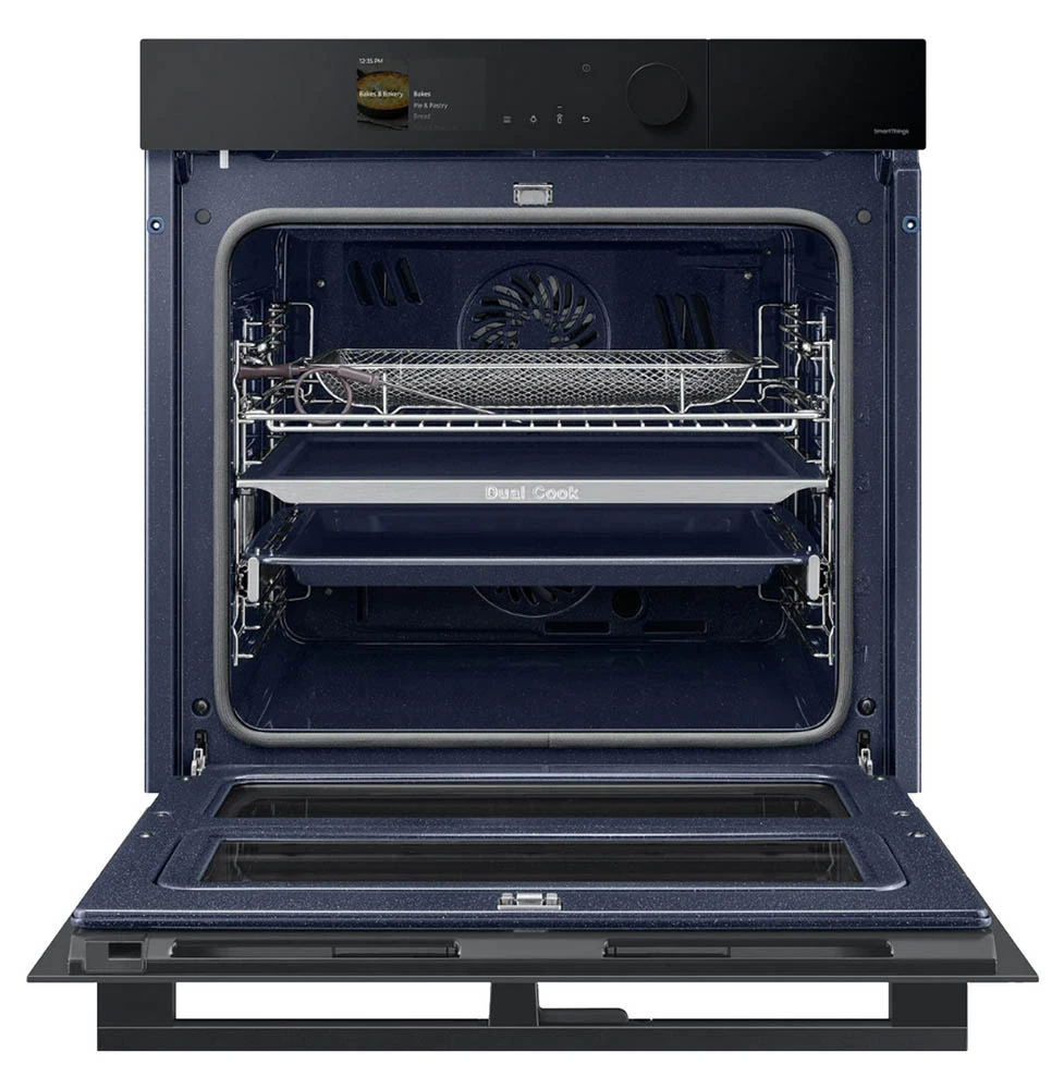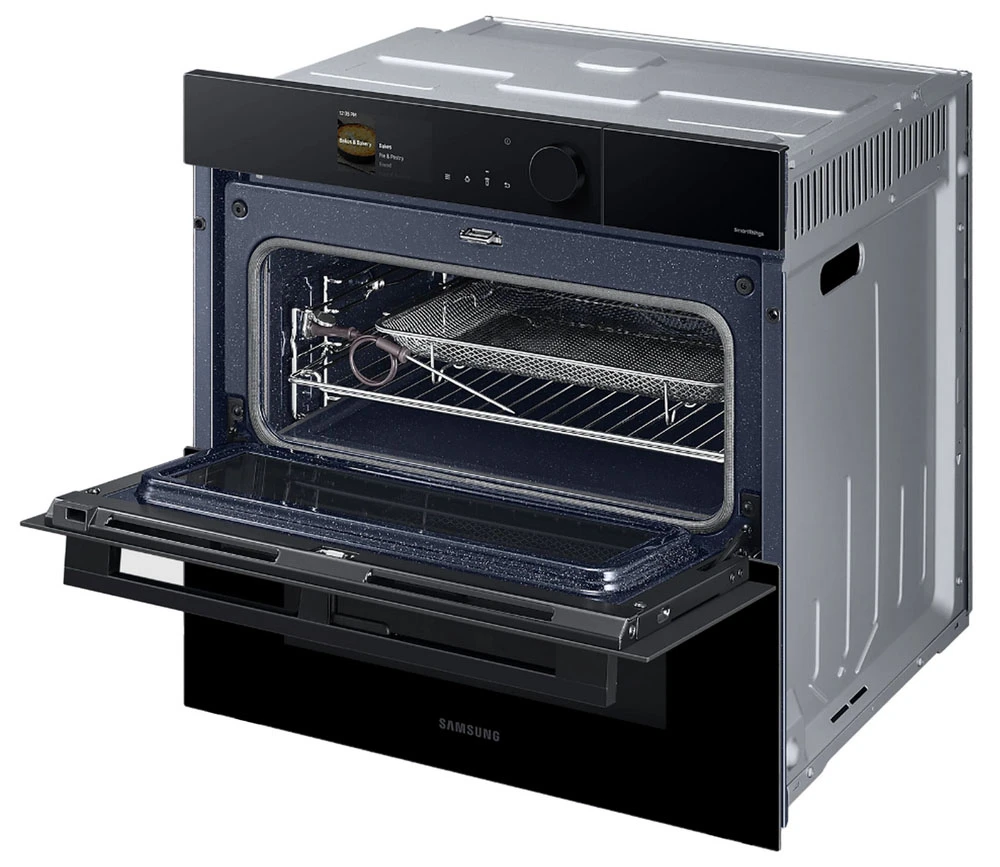 Vestavná trouba Dual Cook s flexibilními dvířky • en. třída A+ • kapacita 76 l • spodní & horní ohřev • gril • Dual Cook Steam – vaření v páře • zdravé smažení Air Fry • systém Air Sous Vide • sonda na maso • SmartThings Cooking • pyrolytické čištění • obrovské množství aut. programů • 4,3" TFT displej • časovač • dětská pojistka • vnitřní osvětlení • 4násobné dveřní sklo • Wi-Fi • výběr jazyka • teleskopická lišta • bohaté příslušenství • barva: černá • rozměry: 59,6 × 59,5 × 57 cm (v × š × h)
