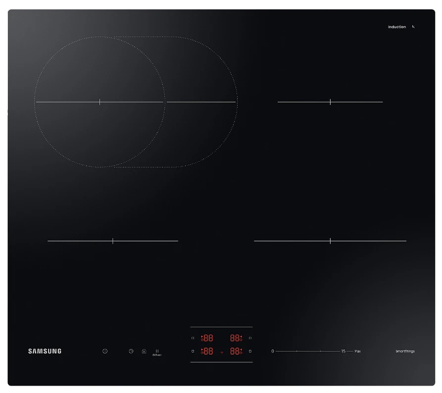 Vestavná indukční varná deska se 4 varnými zónami • Oval Zone pro pohodlné používání oválných hrnců a pánví • intuitivní posuvné ovládání teploty • Power Boost pro maximalizaci výkonu • minutka • automatická detekce hrnců/malých nádob • indikátor zůstatkového tepla • dětská pojistka • funkce automatického vypnutí • možnost ovládání přes Wi-Fi • podpora SmartThings • automatická konektivita s digestoří (Bluetooth) • čisté rozměry: 4,8 × 59 × 52 cm (v × š × h)